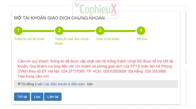 Màn hình sẽ hiện lên thông tin liên hệ để Khách hàng hoàn tất thủ tục Mở tài khoản tại FPTS.
