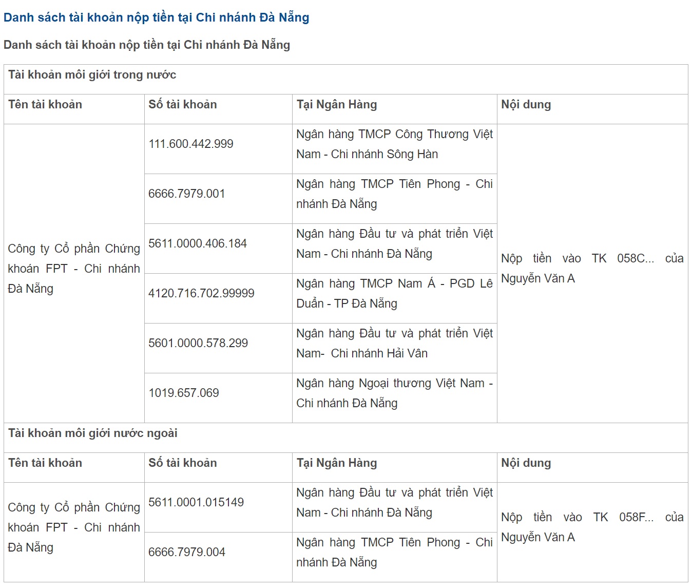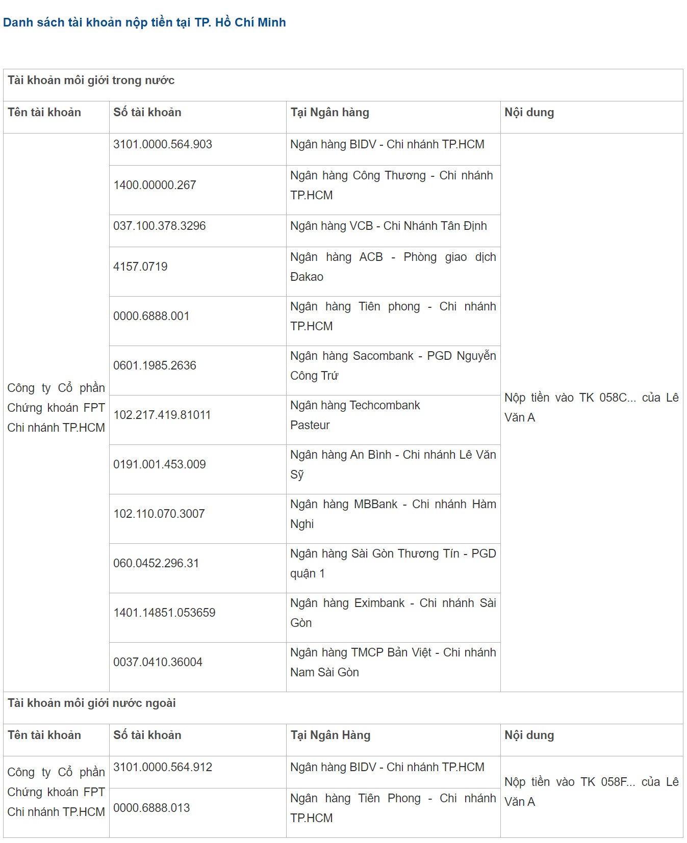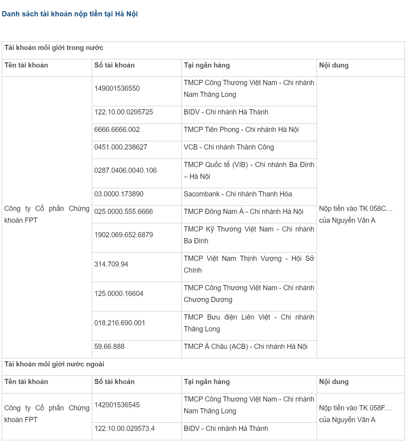 Danh sách số tài khoản ngân hàng Công ty CP Chứng khoán FPT