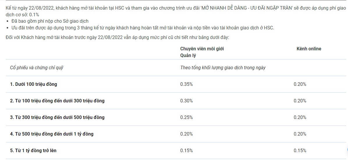 Tuy nhiên phí giao dịch cổ phiếu tại HSC là 0.2%/giá trị giao dịch là hơi cao so với mặt bằng chung của thị trường (TCBS và VPS chỉ 0.1%, VNDirect là 0.15%) nhưng bù lại chất lượng dịch vụ và chăm sóc khách hàng.