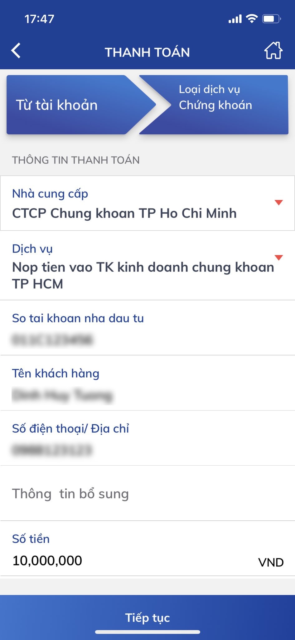 5. Hướng dẫn nộp tiền vào tài khoản chứng khoán HSC