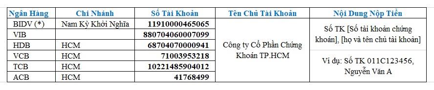 HSC khuyến khích Quý khách chuyển vào ngân hàng có liên kết với HSC (đánh dấu *) để tiền vào Tài khoản Chứng khoán của Quý khách nhanh nhất.