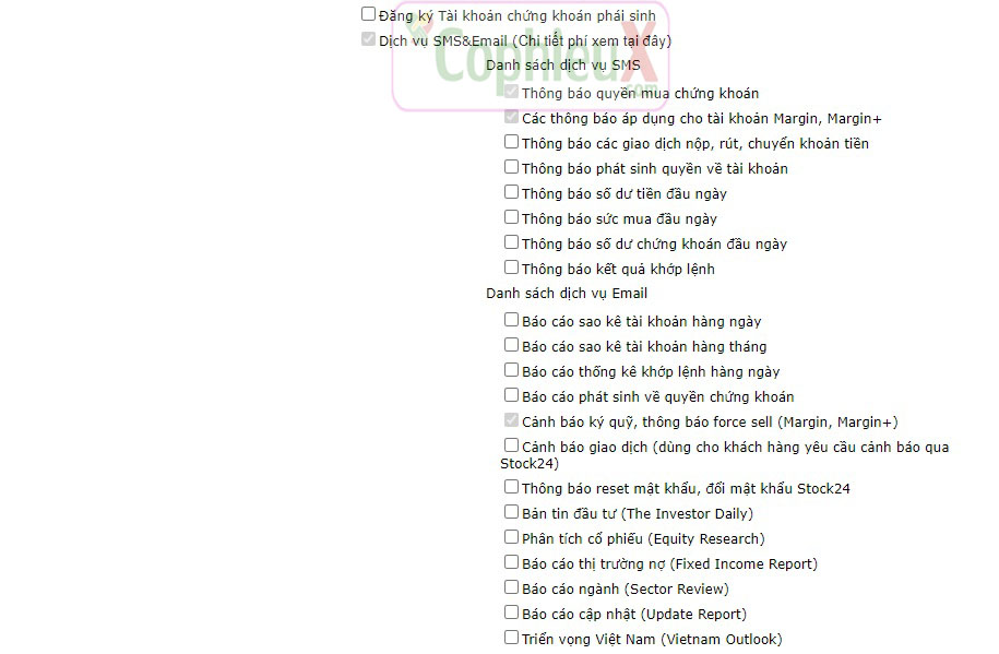 Tại mục Dịch vụ chứng khoán, Quý khách Click Chọn tất cả 5 dịch vụ chứng khoán (5 dịch vụ này miễn phí) gồm: