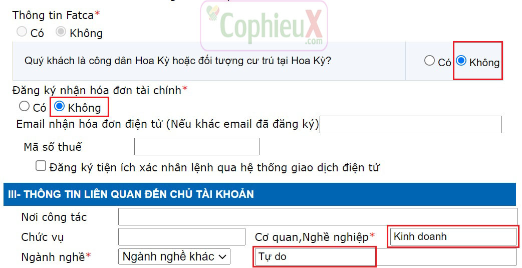 Tại mục Cơ quan, nghề nghiệp: Quý khách nhập Kinh doanh hoặc bất cứ nghề nghiệp gì quý khách muốn