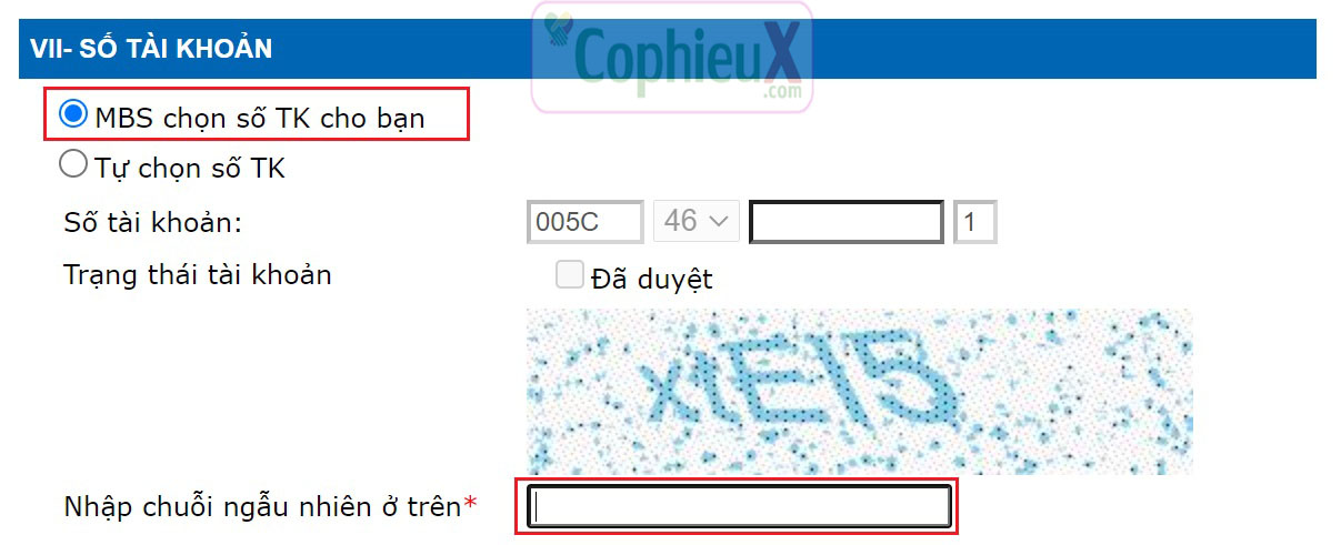 Nếu Quý khách muốn chọn số tài khoản đẹp thì Click chọn Tự chọn số TK và nhập 4 chữ số vào ô trống (4 ký tự số). Vì số đẹp đa số người khác đã chọn nên số tài khoản hay thông báo đã bị trùng sẽ khiến quý khách tốn nhiều thời gian và công sức. nên tốt nhất cứ để mặc định MBS chọn số tài khoản cho bạn để hệ thống tự động chọn ngẫu nhiên..