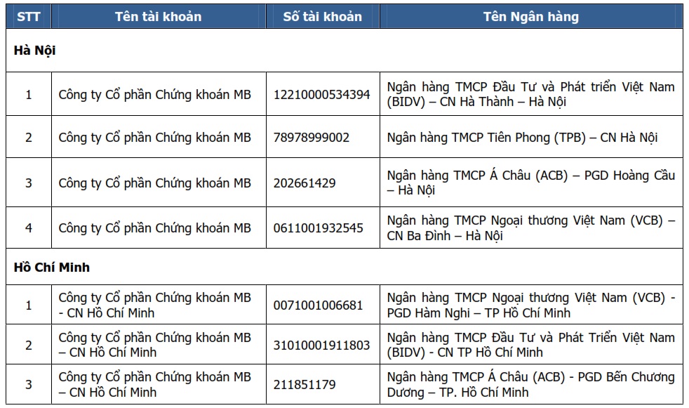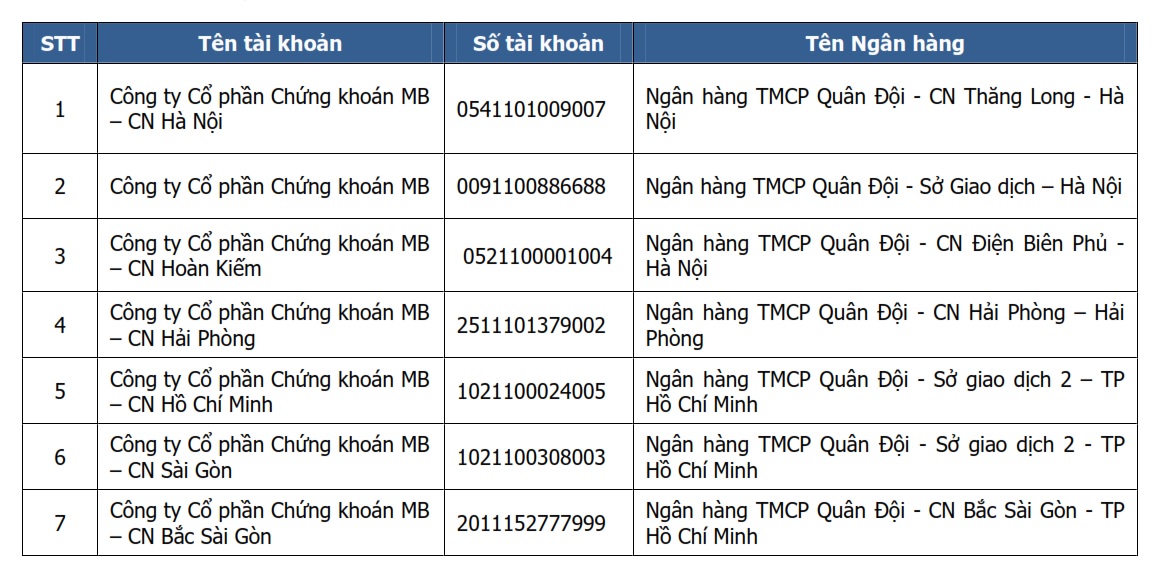 - Tài khoản nhận là tài khoản tiền gửi của MBS tại Ngân hàng TMCP Quân Đội (MB) trong danh sách dưới đây: