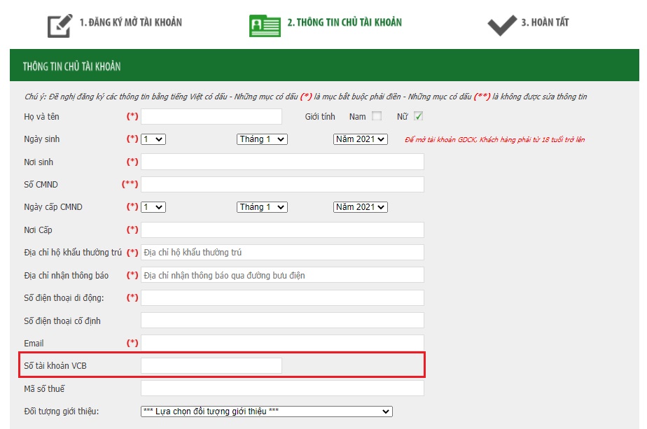 Mục Số tài khoản VCB quý khách nhập số tài khoản ngân hàng Vietcombank của mình đang sử dụng để sau này dùng tài khoản Vietcombank này để thực hiện việc nộp tiền hay rút tiền từ tài khoản chứng khoán VCBS. Nếu chưa có tài khoản thì quý khách để trống sau này bổ sung sau.
