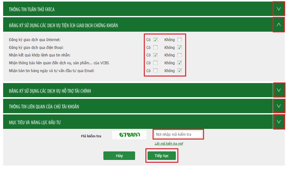 Tại 5 mục màu xanh lá cây bên dưới gồm: Thông tin tuân thủ FATCAT; Đăng ký sử dụng các dịch vụ tiện ích giao dịch chứng khoán; Đăng ký sử dụng các dịch vụ hỗ trợ tài chính; Thông tin liên quan của chủ tài khoản; Mục tiêu và năng lực đầu tư – quý khách có thể giữ nguyên theo mặc định có sẵn của VCBS.