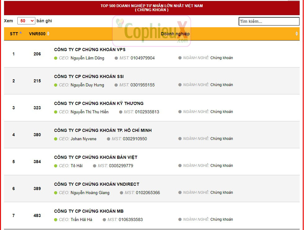 Dưới đây là bảng xếp hạng công ty chứng khoán lớn nhất Việt Nam theo VNR500.