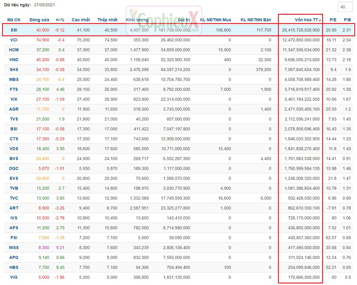 Căn cứ theo số liệu bảng xếp hạng thì SSI – Công ty CP Chứng khoán SSI là công ty chứng khoán lớn nhất Việt Nam theo tiêu chí vốn hóa thị trường. Hiện SSI có vốn hóa hơn 26.000 tỷ đồng, SSI cũng là công ty chứng khoán đầu tiên và duy nhất của Việt Nam có vốn hóa trên 1 tỷ usd (23.000 tỷ đồng).