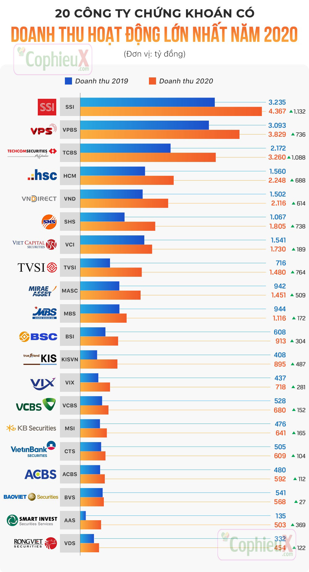 Dưới đây là bảng xếp hạng công ty chứng khoán có doanh thu lớn nhất Việt Nam năm 2020.