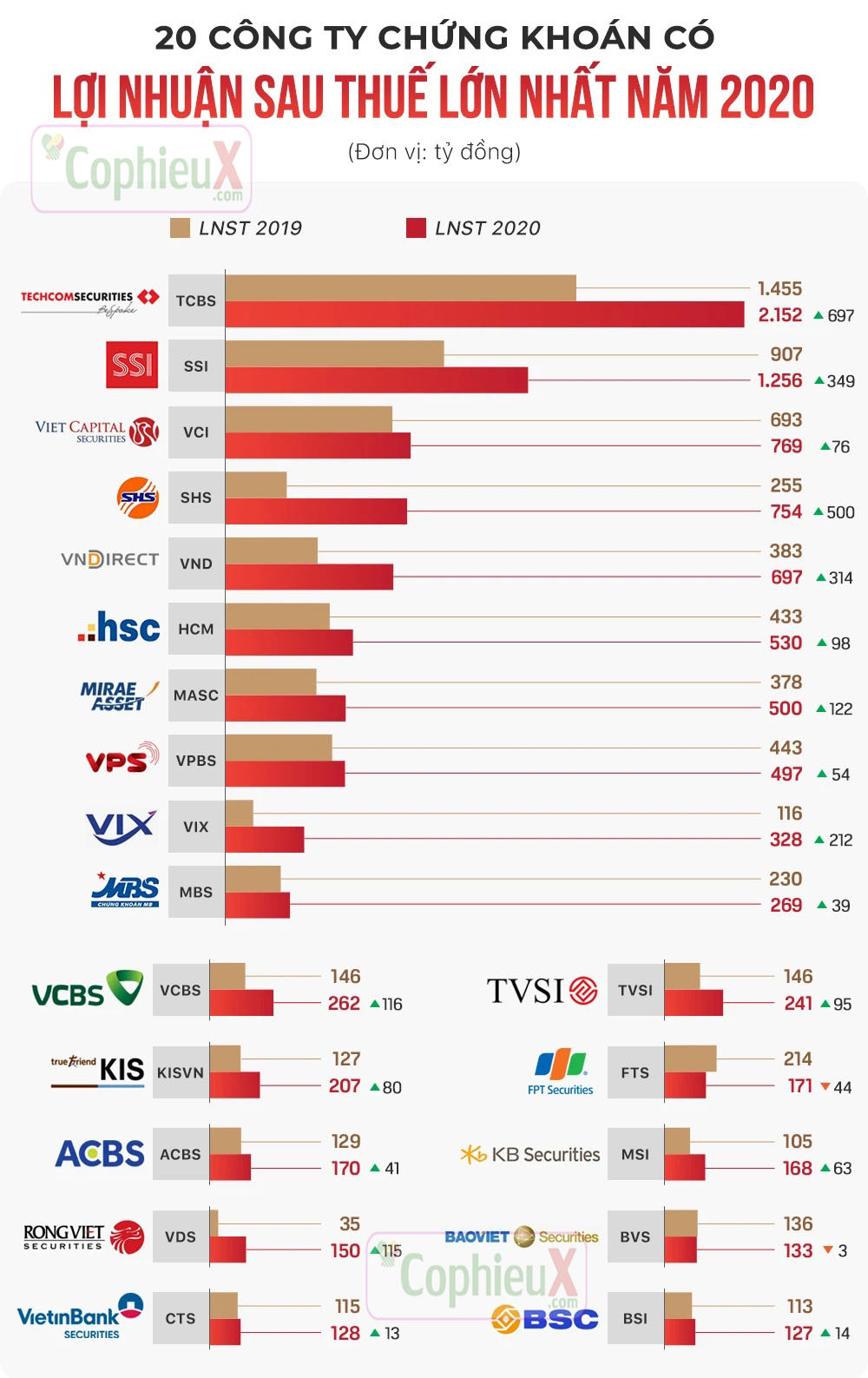 Quán quân về lợi nhuận trong năm 2020 là CTCP Chứng khoán Kỹ thương (Techcom Securities, TCBS) với mức lãi sau thuế 2.152 tỷ đồng, tăng 697 tỷ đồng so với 2019. Theo thống kê, TCBS cũng là công ty chứng khoán tăng trưởng mạnh nhất về lợi nhuận trong năm qua.