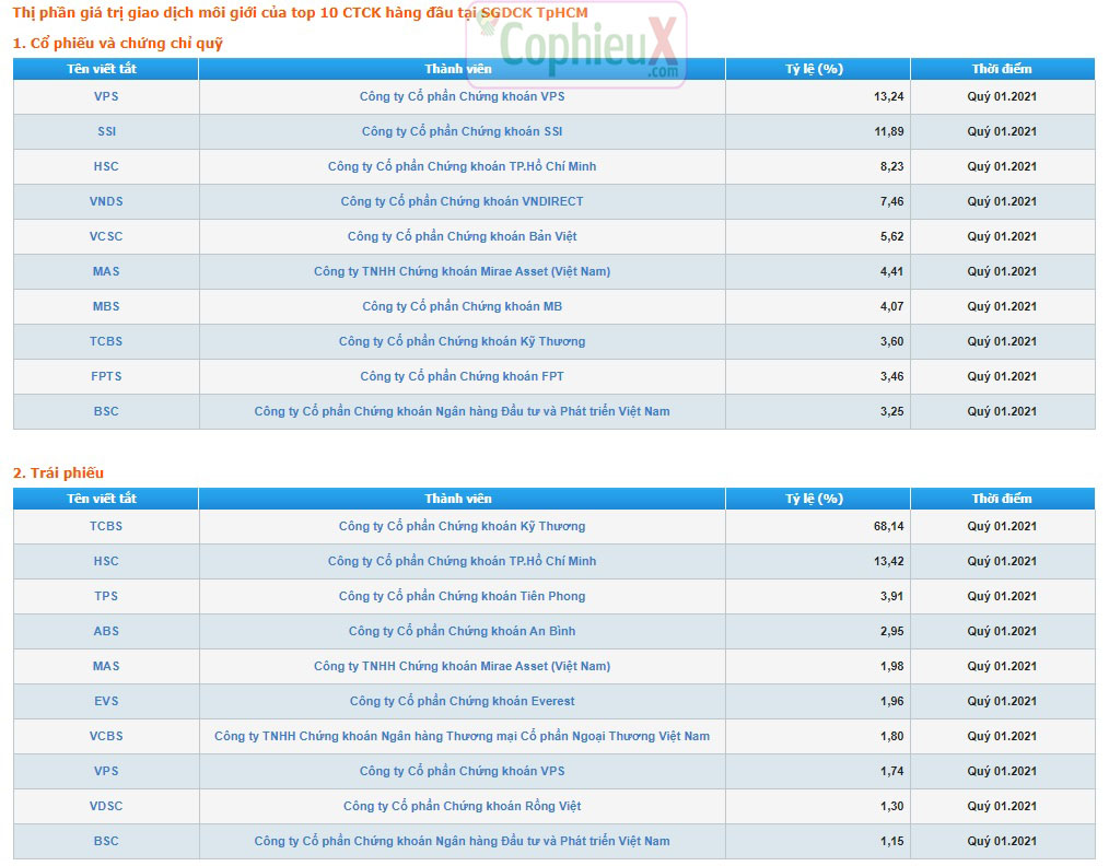 Tiếp đến là công ty chứng khoán VPS, TCBS, HSC (mã HCM), VNDirect (mã VND)…