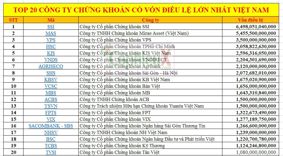 Dưới đây là bảng xếp hạng công ty chứng khoán có vốn điều lệ lớn nhất Việt Nam: