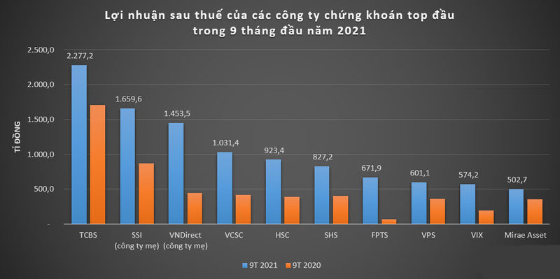 Lũy kế 9 tháng đầu năm 2021, có 4 công ty chứng khoán báo lãi sau thuế vượt mức nghìn tỉ, bao gồm: TCBS (2.277,2 tỉ đồng), SSI (1.659,6 tỉ đồng), VNDirect (1.453,5 tỉ đồng) và VCSC (1.031,4 tỉ đồng).