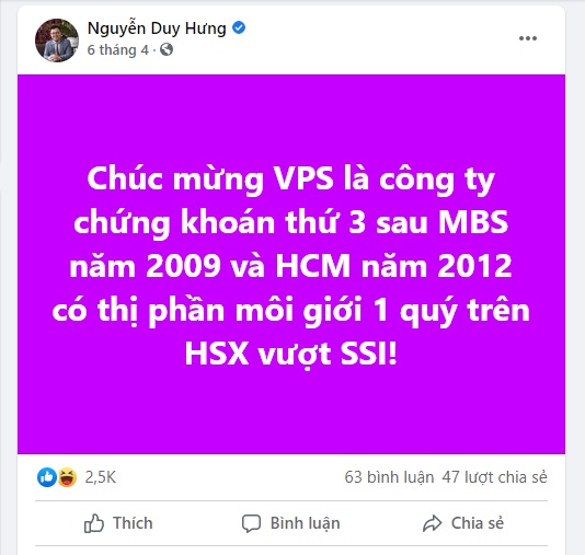 Khi VPS vươn lên số 1 trong Quý 1/2021, Chủ tịch SSI Nguyễn Duy Hưng đã tự tin đăng một bài Post trên trang Facebook cá nhân rằng: