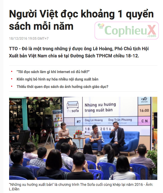 Nước Việt Nam ta mỗi người đọc tầm 1 cuốn sách/năm (không tính sách giáo khoa, tính cả sách điện tử). Một số nước trong khu vực: Singapore 14 cuốn/năm, Malaysia 10 cuốn/năm, Thái Lan 7 cuốn/năm.