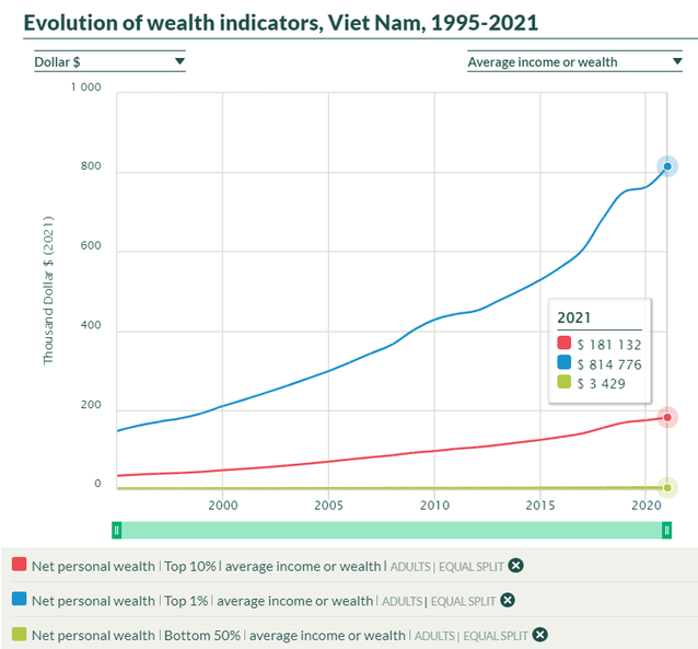 [Dữ liệu 2021] Để lọt vào top 1% dân số có tài sản lớn nhất Việt Nam, bạn cần có tài sản tối thiểu là 259.149 USD (gần 6 tỷ VND), và để lọt vào top 10% thì bạn cần có tài sản tối thiểu 61.313 USD (gần 1,4 tỷ VND). Nguồn: Cơ sở dữ liệu về Bất bình đẳng Thế giới